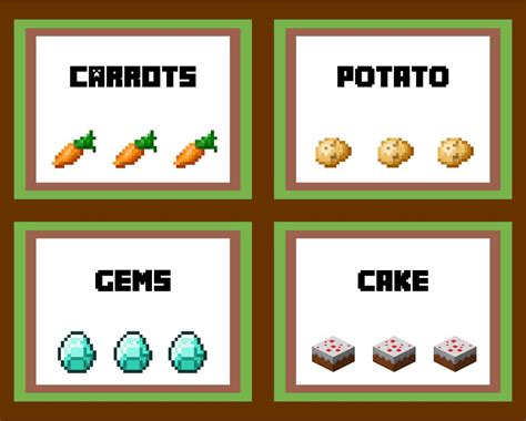 Minecraft inspired printable food tents Great decoration for Minecraft themed birthday party 43 food labels and 5 blank labels. With this item you'll receive: 12 Sheets 4 labels on each sheet Each sheet is 8,5x11 inches PNG and PDF files 300 dpi.